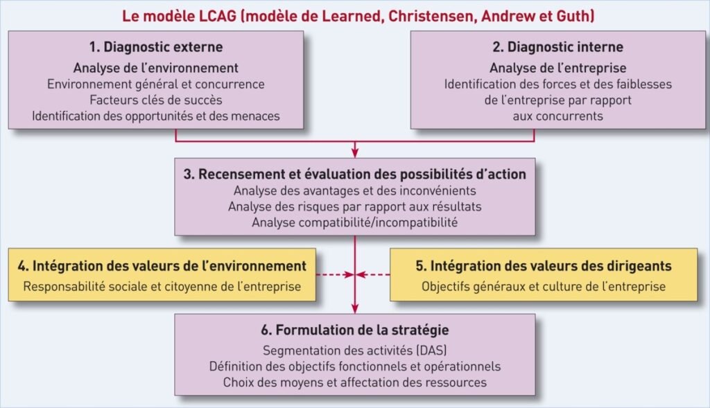 • Son modèle LCAG (Learned, Christensen, Andrews et Guth), popularisé sous le nom de SWOT, articule l’analyse interne (forces et faiblesses) et externe (opportunités et menaces) de l’entreprise.