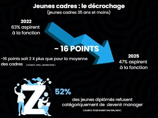 - Seuls 34% des cadres non-managers souhaitent accéder à des responsabilités managériales . Soit -8 points de moins en trois ans. Chez les moins de 35 ans, l’effondrement est encore spectaculaire : 47% seulement aspirent à devenir managers, contre 63% en 2022 . Une chute de 16 points en à peine trois ans.