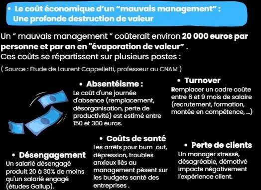 Laurent CAPPALLETI, professeur au CNAM, estime que le mauvais management coûterait environ 20 000 euros par personne et par an en « évaporation de valeur » . Sur une entreprise de 1 000 salariés, cela représenterait 20 millions d’euros détruits annuellement.
