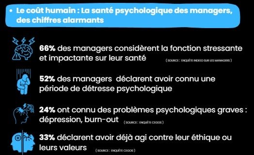 Ceux qui exercent la fonction sont encore moins convaincus. Seuls 25% des managers se disent pleinement engagés dans leur rôle (Gallup, 2023). 75% sont donc en situation de désengagement partiel ou total. Les chiffres sur leur santé psychologique sont alarmants : 52% sont en détresse psychologique contre 48% des salariés ;33% déclarent avoir agi contre leur éthique ou leurs valeurs contre 25% des salariés (Enquête Cegos), 43% considèrent avoir trop de responsabilités (Synthèse études managériales 2015-2025).