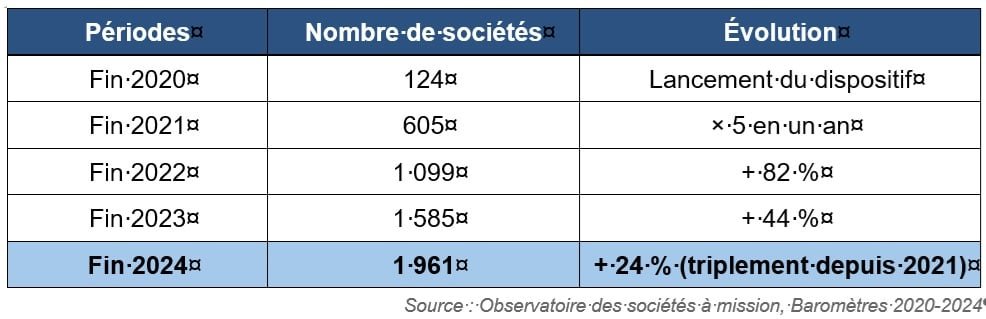 Le décret d’application du 2 janvier 2020 rend le dispositif opérationnel. À la fin de cette première année, 124 sociétés ont franchi le pas. Un an plus tard, elles sont 605. Fin 2022, le cap du millier est dépassé avec 1 099 entreprises. Le 8eme Baromètre de l’Observatoire des sociétés à mission recense 1 961 sociétés à mission fin 2024, représentant plus d’un million de salariés.